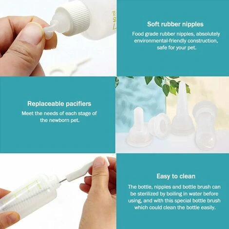 Emballage: 1 flacons de soin pour animaux de compagnie, 4 tétines souples, 1 brosses de nettoyage,1 aiguille.