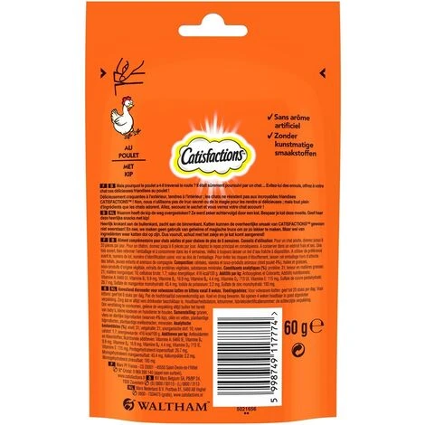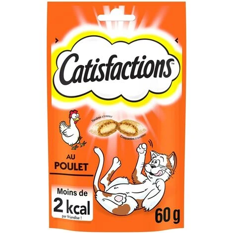 Aliment complémentaire pour chats adultes et chatons de plus de 8 semaines – Au Poulet. Délicieuses friandises Catisfactions craquantes à l’extérieur et tendres à l’intérieur pour lesquelles les chats feraient n’importe quoi ! Non, nous n’utilisons pas de truc secret ou de la magie pour les rendre si délicieuses ; mais tous plein d’ingrédients que les chats adorent. Allez, secouez le sachet et vous verrez votre chat accourir !