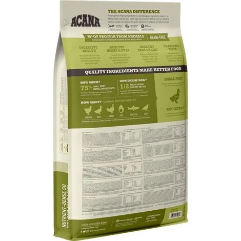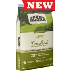 COMPOSITION: Viande de canard fraîche (11%), viande de poulet fraîche (11%), œufs frais de poules élevées en liberté (8%), viande de poulet déshydratée (7%), viande de dinde déshydratée (7%), corégone déshydraté (7%), haricots Pinto entiers, pois entiers, viande de dinde fraîche (6%), gras de canard (5%), lentilles rouges entières, pois chiches entiers, lentilles vertes entières, viande de caille crue (4%), abats de poulet frais (foie, cœur) (2%), huile de goberge (2%), abats de dinde frais (foie, cœur) (2%), ?bres de lentilles, viande de canard déshydratée (1%), foie de canard (1%), cartilages de canard (0.5%), foies de poulet et dinde lyophilisés (0.5%), varech séché, citrouille entière fraîche, courge musquée entière fraîche, chou frisé frais, épinards frais, feuilles de navet fraîches, carottes fraîches, pommes fraîches, poires fraîches, canneberges entièresfraîches, myrtilles entières fraîches (bleuets), racine de chicorée, racine de curcuma, chardon marie, racine de bardane, lavande, racine de guimauve, fruits de l’églantier. ADDITIFS (par kg) : Additifs technologiques: Avec antioxydants naturels. Additifs nutritionnels: Chlorure de Choline : 1200 mg, Taurine : 400 mg, Zinc (Chélate de zinc d’hydrate d’acide aminé ): 150 mg, Vitamine B1: 25 mg, Vitamine B2: 10 mg, Niacine: 50 mg, Vitamine B5: 8 mg, Vitamine B6: 7.5 mg, Acide folique : 0.75 mg, Biotine : 0.01 mg, Vitamine B12: 0.1 mg, Vitamine A: 1875 IU, Vitamine D: 250 IU, Vitamine E: 150 IU, Cuivre (Chélate de cuivre (II) d’acides aminés, hydraté): 11mg, DL-methionine : 99 mg. Additifs zootechniques : Enterococcus faecium NCIMB10415: 600×10^6CFU.Protéines 37 %, Matières grasses 18 %, Fibres brutes 3%, Cendres brutes 9%, Humidité 10%, Calcium 1,9 %, Phosphore 1,3%, Magnésium 0,1 %, Taurine 0,1 %, Oméga-6 2,5%, Oméga-3 0,8%, DHA 0,2 %, EPA 0,2%Regorgeant de viandes d’animaux nourris à l’herbe, de canard élevé en liberté, d’œufs pondus au nid et de poissons d’eau douce, ACANA Grasslands nourrit votre chat de façon naturelle, sans longue liste d’additifs. Avec peu de glucides et beaucoup de protéines animales, cette alimentation favorise une condition physique optimale pour tous les chats.