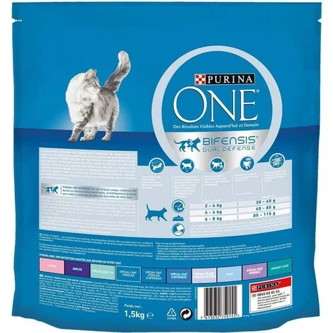 La castration/stérilisation des chats engendre des modifications hormonales qui influent sur leur métabolisme, leur poids et leurs voies urinaires. Développées en collaboration avec des vétérinaires et des nutritionnistes, les croquettes PURINA ONE Chat Stérilisé saumon et blé fourniront à votre chat castré/stérilisé tout ce dont il a besoin pour se sentir bien. Avec un profil nutritionnel adapté en matière de teneurs en matières grasses et protéines, ces croquettes aideront votre chat à préserver un bon métabolisme, sa masse musculaire ainsi que son poids de forme après avoir été castré/stérilisé.La formule Bifensis Dual Defense de PURINA ONE renforce naturellement les défenses naturelles de votre chat et améliore son bien-être, à l’intérieur comme à l’extérieur. Outre les bactéries fonctionnelles qui agissent dans le tube digestif, les croquettes PURINA ONE Chat Stérilisé au saumon pour chat contiennent également des acides gras oméga 6 et du zinc qui contribuent à la santé de la peau et du pelage. Leur recette contient également tous les nutriments essentiels au bien-être de votre chat. Enfin, d’autres ingrédients permettent de réduire la formation de tartre de 40 %.La teneur équilibrée en minéraux contribue à la santé des voies urinaires en soulageant le métabolisme et en permettant de maintenir le pH urinaire à un taux idéal pour empêcher les infections. Ces croquettes PURINA ONE élaborées pour les chats stérilisés sont préparées avec des ingrédients de qualité, sans ajout de colorants, arômes ni conservateurs artificiels.Ingrédients :saumon (15 %), blé (15 %), protéines de volaille déshydratées, maïs, farine de gluten de maïs, farine de gluten de blé, graisse animale, pulpe de betterave déshydratée, racine de chicorée déshydratée, protéines de poisson déshydratées, farine de soja, minéraux, hydrolysat (avec ajout de Lactobacillus Delbrueckii et 0,025% de fermentum en poudre), levure.Additifs :Additifs nutritionnels : vitamine A (36 960 UI / kg), vitamine D3 (1 200 UI / kg), vitamine E (460 UI / kg), vitamine C (140 mg / kg), taurine (780 mg / kg), sulfate de fer monohydraté (230 mg) / kg), iodate de calcium anhydre (2,9 mg / kg), sulfate de cuivre pentahydraté (46 mg / kg), sulfate de manganèse monohydraté (110 mg / kg), sulfate de zinc monohydraté (390 mg / kg), sélénite de sodium (0,27 mg / kg).