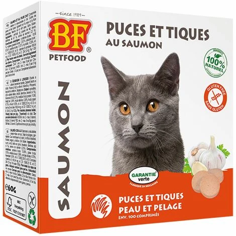Ces friandises en forme de comprimés sains et savoureux à l’ail et au saumon vont permettre de lutter efficacement contre les puces et les tiques. Sans Gluten, ces friandises sont un anti-parasitaire naturel. Conditionnement : boite de 100 comprimés. Friandises en forme de comprimés Biofood à l’ail et au saumon Luttent efficacement contre les puces et les tiques. Friandises 100% naturelles et sans gluten. Au saumon très appétent pour votre félin. Bon pour la peau et le pelage (y compris la perte de poils). Améliore le système cardiovasculaire. Riches en vitamines et minéraux. Pour toutes les races de chat, du chaton au senior. Le comprimé peut être donné tel quel à votre félin ou écraser dans sa nourriture.