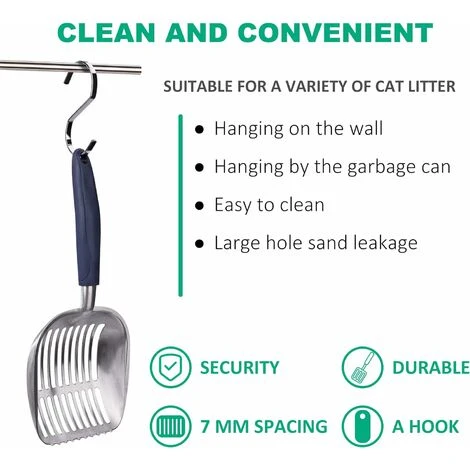 Conception unique: les fentes de 0,5 cm sont suffisamment larges et très efficaces pour ramasser les touffes et tamiser la litière propre, fonctionne avec la plupart des litières pour chats grandes et collantes.
