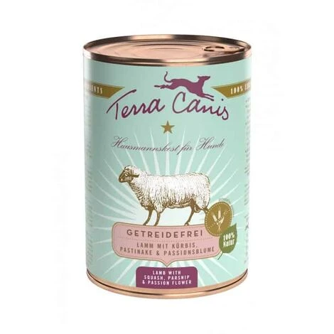 Recette d’agneau à la courge, au panais et au passiflore.Terra Canis Sans Céréales a été spécialement développé pour les chiens qui doivent, par conviction ou pour des raisons nutritionnelles, être nourris sans céréales. Cette gamme est particulièrement adaptée pour tous les chiens qui souffrent d’intolérance aux céréales et au lactose. Pour de nombreuses maladies, un régime alimentaire sans céréales est recommandé en complé- ment d’un traitement médical.cÅ“ur d’agneau (42 %), poumon d’agneau (12 %), carotte, potiron (11 %), pomme, panais (8 %), pêche, huile de lin, farine de noix de coco, farine de lupin, levure de bière, poudre de coquille d’Å“uf, passiflore (0,4 %), algue marine, pissenlit, basilic, sauge (0,2 %), sel des Andes, argile, ciboulette, pollen de fleurs