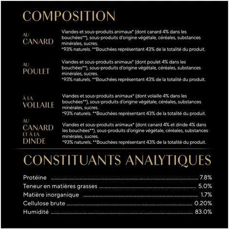 Composition détaillée : Au canard : Composition: viandes et sous-produits animaux (44%, dont 94% naturels*, dont canard 4%), céréales, substances minérales, sucres. *ingrédients naturels.