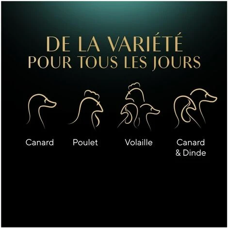Au canard et à la dinde : Composition: viandes et sous-produits animaux (44%, dont 94% naturels*, dont canard 4%, dinde 4%), céréales, substances minérales, sucres. *ingrédients naturels.