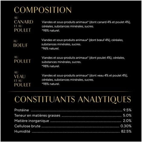 Composition détaillée : Au Canard : viandes et sous-produits animaux (65%, dont 92% naturels*, dont canard 4%), substances minérales, sucres.