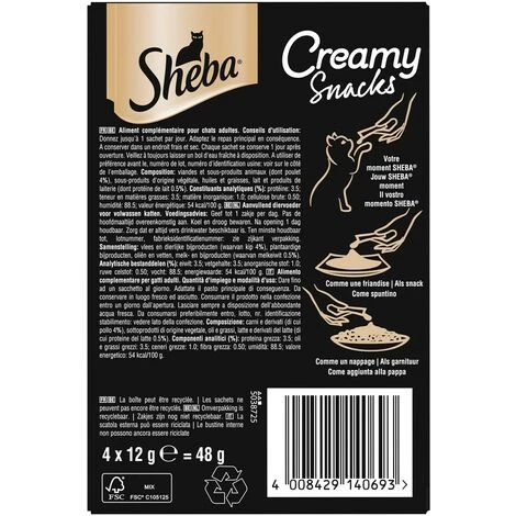 Aliment complémentaire pour chats adultes – au Poulet. Sheba Creamy Snacks, une délicieuse friandise à la texture crémeuse, destinée à être donnée à la main. Une expérience spéciale que vous allez adorer partager avec votre chat. Il est également possible d’utiliser Creamy Snacks comme une friandise proposée sur une assiette ou comme un nappage sur les croquettes. Chaque snack est emballé individuellement, de sorte que la fraîcheur et la qualité du produit soient conservées. Elaborées par nos nutritionnistes et nos vétérinaires du centre de recherche WALTHAM, les friandises Creamy Snacks de Sheba sont sans sucre ajouté, sans colorants ni arômes artificiels. La boîte peut être recyclée.