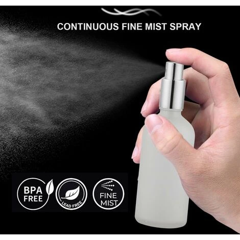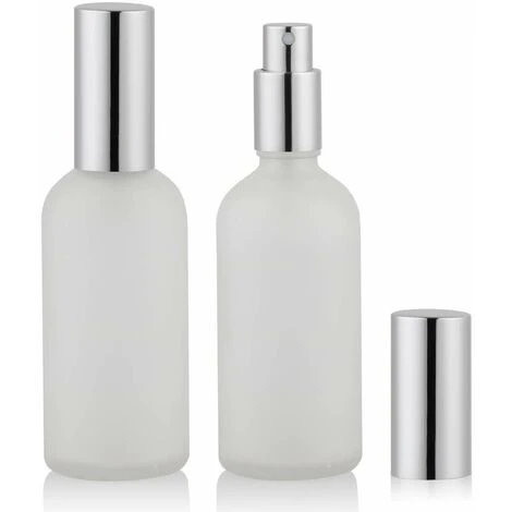 - Lot de 2 flacons vaporisateurs en verre dépoli de 3,4 oz, bouchon vaporisateur en aluminium argenté métallisé et capuchon anti-poussière