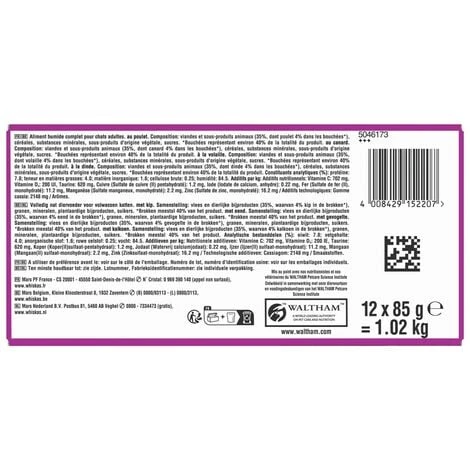 Un repas complet et équilibré qui apporte à votre chat les nutriments essentiels dont il a besoin pour rester en pleine forme: des protéines de haute qualité pour contribuer à des muscles forts, de la vitamine C pour aider au maintien des défenses naturelles, du zinc pour contribuer à une peau et un pelage sains. Nourriture pour chat mise au point avec nos nutritionnistes et nos vétérinaires du centre de recherche WALTHAM – Principale référence mondiale pour la nutrition et le bien-être des animaux de compagnie.