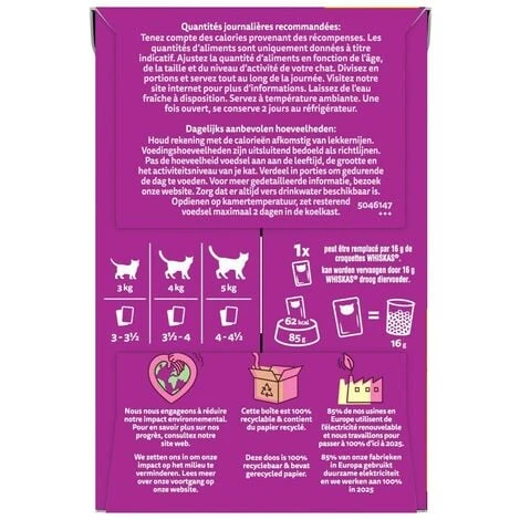Nous nous sommes donnés pour mission de réduire notre empreinte environnementale afin de garantir un avenir où nos chatons et nos chats continuerons à ronronner en toute tranquillité. À ce jour, le poisson utilisé dans nos recettes provient de sources durables. 85 % de nos usines en Europe utilisent de l’électricité renouvelable et nous travaillons pour passer à 100% d’ici à 2025. Nous innovons pour rendre nos emballages toujours plus recyclables. Le carton qui conditionne nos sachets est déjà 100 % recyclable et contient du papier recyclé.