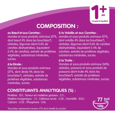 Composition détaillée : Au Boeuf et aux Carottes: viandes et sous-produits animaux (37%, dont boeuf 4% dans les bouchées*), céréales, légumes (dont 0.6% de carottes déshydratées, équivalent à 4% de carottes), extraits de protéines végétales, substances minérales, sucres. *Bouchées représentant environ 47% de la totalité du produit. A la Volaulle et aux Carottes: viandes et sous-produits animaux (37%, dont volaille 4% dans les bouchées*), céréales, légumes (dont 0.6% de carottes déshydratées, équivalent à 4% de carottes), extraits de protéines végétales, substances minérales, sucres. *Bouchées représentant environ 47% de la totalité du produit.