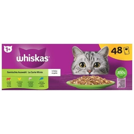 Aliment humide complet pour chats adultes à partir de 1 an – Adapté aussi aux chats stérilisés – Sachets fraîcheur Whiskas La Carte Mixte en gelée 4 variétés (au Boeuf / au Poulet /au Saumon / au Thon).