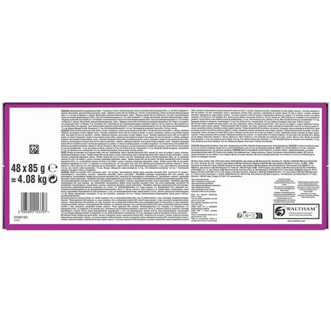 Un repas complet et équilibré qui apporte à votre chat les nutriments essentiels dont il a besoin pour rester en pleine forme: des protéines de haute qualité pour contribuer à des muscles forts, de la vitamine C pour aider au maintien des défenses naturelles, du zinc pour contribuer à une peau et un pelage sains. Nourriture pour chat mise au point avec nos nutritionnistes et nos vétérinaires du centre de recherche WALTHAM – Principale référence mondiale pour la nutrition et le bien-être des animaux de compagnie.