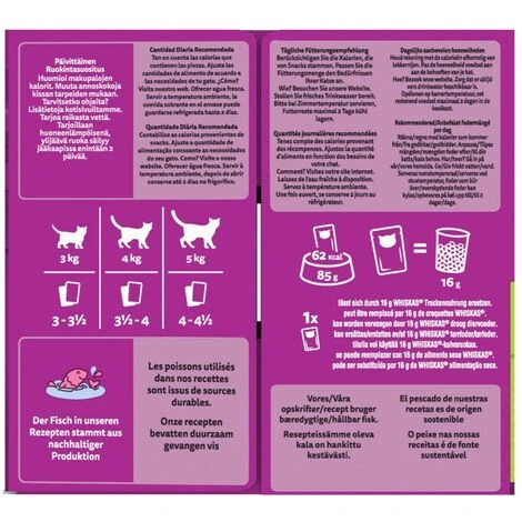 Et en tant qu’amoureux des chats, nous savons que leur ronronnement est le son le plus doux pour vos oreilles. C’est pourquoi chez Whiskas, nous mettons toute notre passion et notre savoir-faire dans la sélection d’ ingrédients de haute qualité et l’élaboration de recettes variées. Nous avons un large choix de recettes procurant à votre chat les protéines dont il a besoin à chaque étape de sa vie, et il en raffole! En plus d’avoir un goût exquis, chaque repas Whiskas fournit à votre chat 100 % de ses besoins quotidiens. Et même si votre chat est exigeant, vous serez surpris par la rapidité à laquelle il va se précipiter vers sa gamelle ! Vous l’entendrez ronronner de plaisir pendant et après son repas.