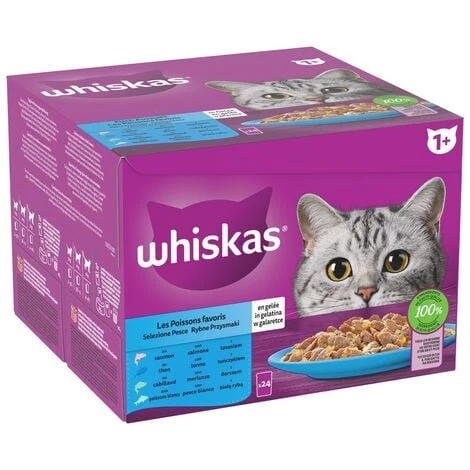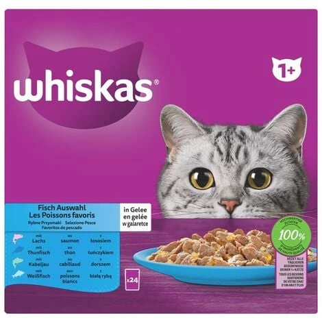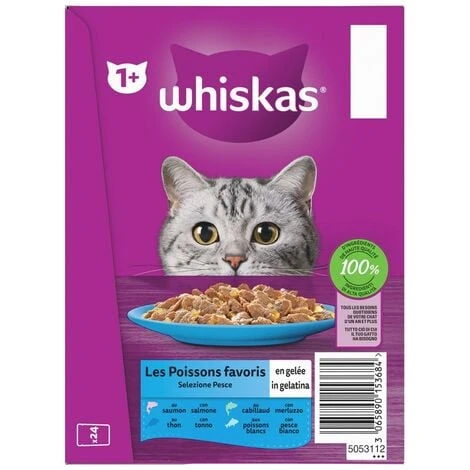 Aliment humide complet pour chats adultes à partir de 1 an – Adapté aussi aux chats stérilisés – Sachets fraîcheur Whiskas Les Poissons favoris en gelée 4 variétés (au Saumon / au Thon / aux Cabillaud / aux Poissons blancs).