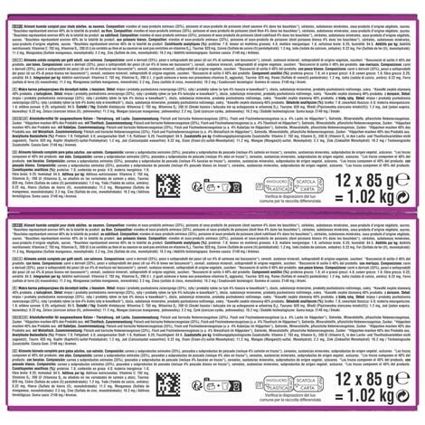Additifs par kg: Additifs nutritionnels: Vitamine C: 702 mg, Vitamine D3: 200 UI (Les variétés au thon et au saumon ne sont pas enrichies en vitamine D3), Taurine: 620 mg, Cuivre (Sulfate de cuivre (II) pentahydraté): 1.2 mg, Iode (Iodate de calcium, anhydre): 0.22 mg, Fer (Sulfate de fer (II), monohydraté): 11.2 mg, Manganèse (Sulfate manganeux, monohydraté): 2.2 mg, Zinc (Sulfate de zinc, monohydraté): 16.2 mg / Additifs technologiques: Gomme cassia: 2148 mg / Arômes.