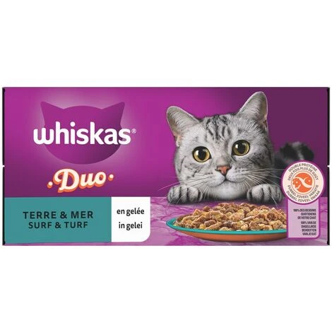Aliment humide complet pour chats adultes à partir de 1 an – Adapté aussi aux chats stérilisés – Sachets fraîcheur Whiskas Duo Terre & Mer en gelée 4 variétés (au Cabillaud et au Poulet / au Saumon et à la Dinde / au Thon et à la Truite / au Boeuf et à la Volaille).