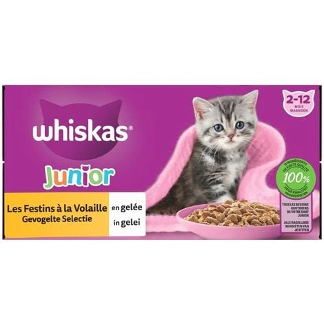 Aliment humide complet pour chatons de 2 à 12 mois – Sachets fraîcheur WhiskasJUNIOR Les Festins à la Volaille en gelée 4 variétés (au Poulet / au Canard / à la Volaille/ à la Dinde).