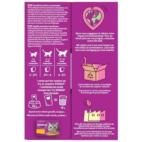 Nous nous sommes donnés pour mission de réduire notre empreinte environnementale afin de garantir un avenir où nos chatons et nos chats continuerons à ronronner en toute tranquillité. À ce jour, le poisson utilisé dans nos recettes provient de sources durables. 85 % de nos usines en Europe utilisent de l’électricité renouvelable et nous travaillons pour passer à 100% d’ici à 2025. Nous innovons pour rendre nos emballages toujours plus recyclables. Le carton qui conditionne nos sachets est déjà 100 % recyclable et contient du papier recyclé.