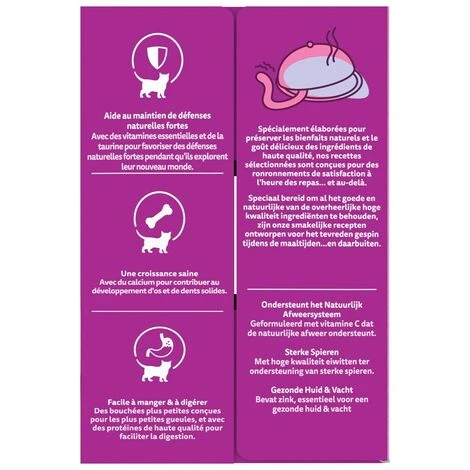Avec des bouchées plus petites conçues pour les plus petites gueules faciles à manger et à digérer. Des recettes spécialement préparées pour chatons avec des ingrédients de haute qualité, une délicate texture et un goût irrésistible pour un plaisir garanti! Offrez à votre chat les saveurs qu’il préfère et toutes les bonnes choses dont il a besoin pour varier les plaisirs tout en l’aidant à grandir heureux et en bonne santé.
